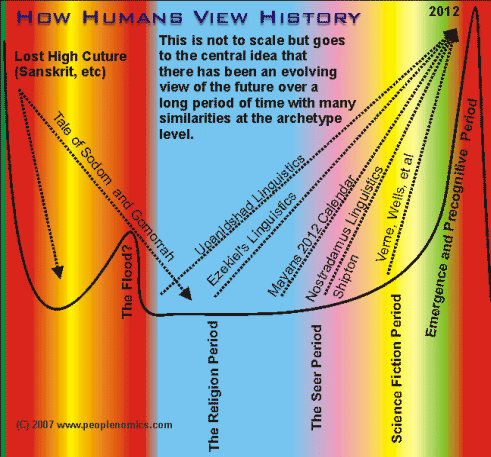 As for how all this relates to 2012? A schematic diagram I sketched up below shows one way humanity's perception of the future may operate - starting first as a religious experience, then moving into active "seers" then "science fiction" then immediate premonition followed almost immediately (on the historical level) by emergence of events.